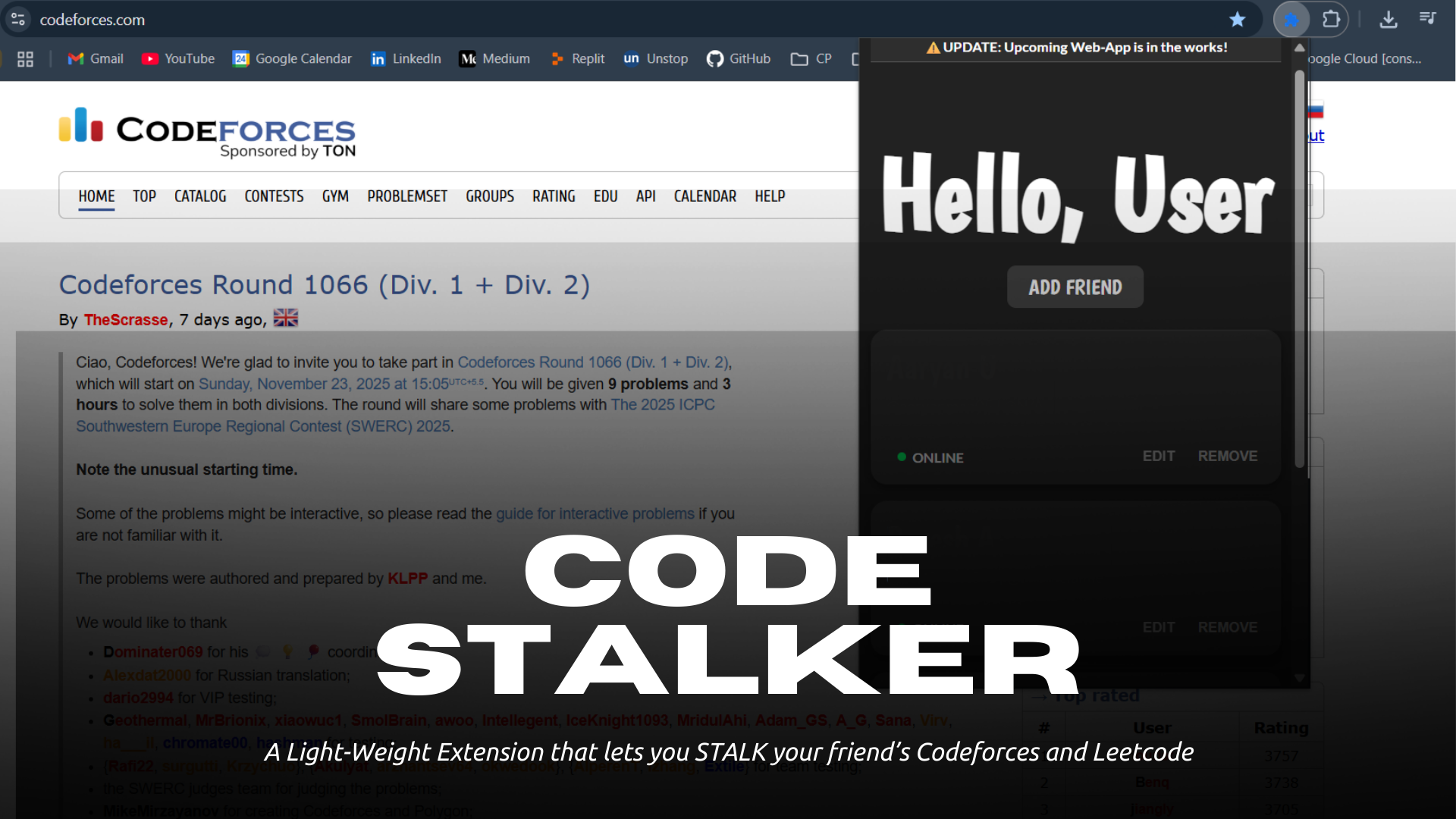 v1.0.1A Lightweight extension that allows you to stalk your friends' Leetcode and Codeforces, and see their CF Status